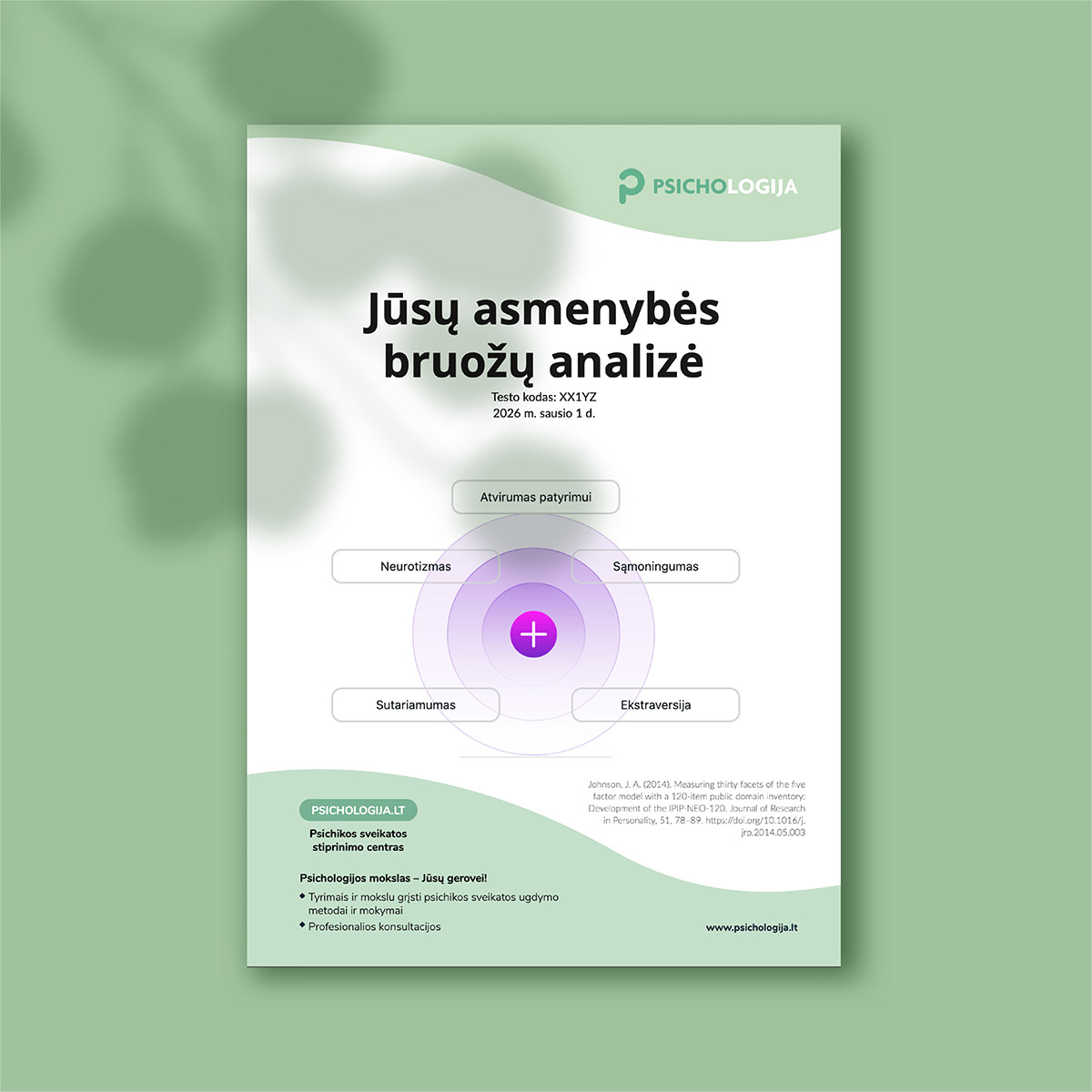 Tai 15–20 puslapių Jūsų asmenybės bruožų analizė, parengta psichologo. Analizėje išsamiai aprašoma, kaip Jūsų asmenybės bruožai veikia mąstymą ir elgesį, kaip priimate sprendimus, sprendžiate konfliktus, kuriate santykius ir kokioje darbo aplinkoje galite geriausiai atsiskleisti. Taip pat aptariamos Jūsų stipriosios savybės, padedančios kasdieniame gyvenime, galimos silpnosios vietos bei pateikiamos individualios vidinio augimo kryptys.